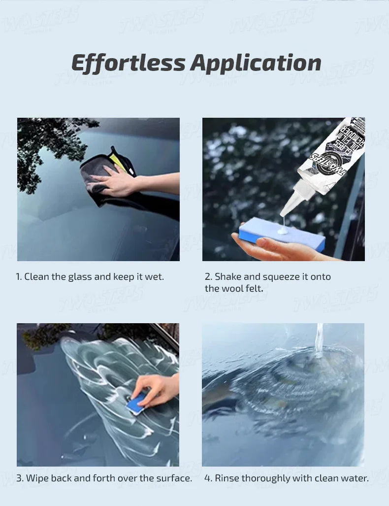 Effortless Application – Clean the glass and keep it wet, shake and squeeze it onto the wool felt, wipe back and forth over the surface, then rinse thoroughly with clean water for a crystal-clear finish.
